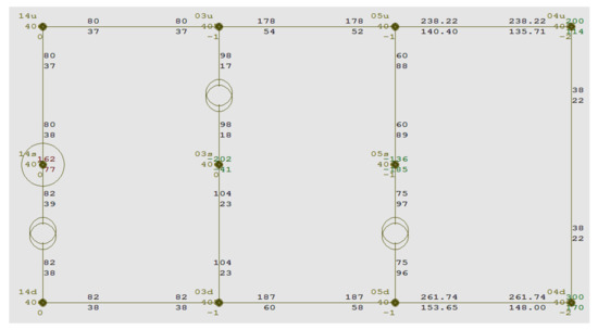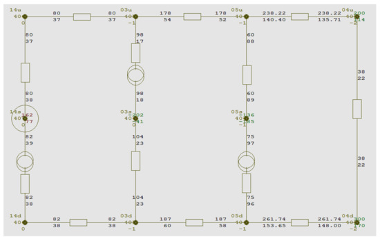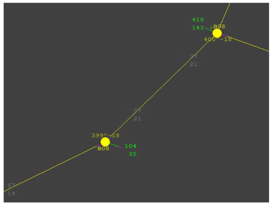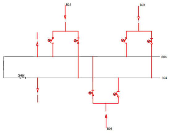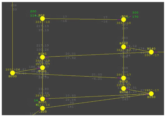 Figure 6, as previously stated, shows a B04 substation division into two smaller substations. The division was conducted by changing the states of the switches connecting the bays with busbar systems. One of the systems was connected with lines from the B14 and B05 substations (.B05 more precisely), and the second system was supplemented with a line connecting the B04 node with the B03 node. In addition to these three fields, the substation also has two outflow fields, consuming around 200 MW and 300 MW, where the switches will not change states.