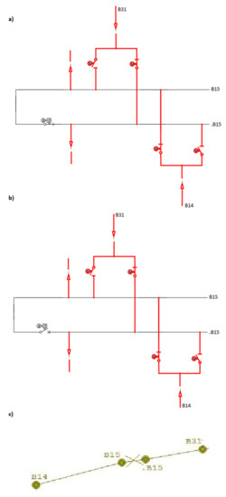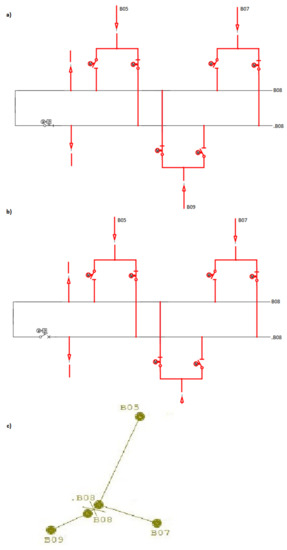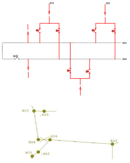 Such an approach enables power (energy) flow analyses and the possibility to divide the system without going deep into the substation structure, since the I&C of the substation will provide follow-up selection (“suggest” for potential application) of the branch switch, e.g., B-.B, and without the need for divisions within the substation, which would be complicated during modelling.