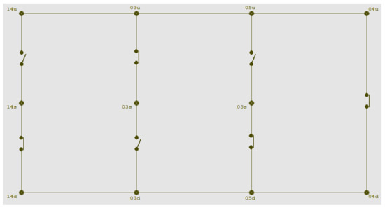 Figure 4 shows a diagram of the substation and the positions (states) of the circuit breakers before the possible division of the substation into two sub-nodes. The operating state of the substation before splitting can be represented in an alternative convention of using a diagram, for example as in