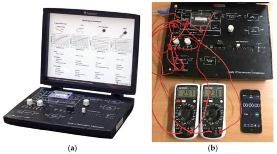 Measurement system to study temperature transducers: (a) measurement setup for testing temperature sensors; (b) connection of the system to study the negative temperature coefficient (NTC) sensor.