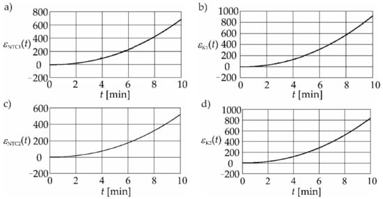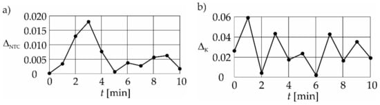 Figure 8 shows the errors and , determined for the NTC and K-type thermocouple sensors as a result of the signal , and the errors and , determined for these sensors as a result of the signal .