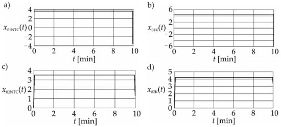 Figure 7 shows the signals —determined by Equation (11)—and —determined by Equation (16)—obtained for both considered sensors by applying the methods described in detail in Section 3. These signals produce and . The signals and are defined by and for the NTC and K-type thermocouple sensors, respectively. The magnitude constraint was assumed to be the highest value of the step responses and Hence, the values of constraints are 3.61 and 4.56 V for the NTC and K-type thermocouple sensors, respectively.