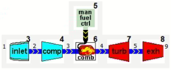 The adopted structure of the engine model (Figure 1) follows the standard turbojet template. To precisely model the engine behavior, we set the design parameters of components, such as the maximum speed, pressure ratio, mass flow rate, fuel flow rate, efficiencies, and so forth. The model was used to simulate the design point, steady states at various engine speeds and transient operation, at sea level and in flight conditions []. The engine model was validated with data gathered from bench tests and the flight missions of the twin-engine aerial target. Residual errors after GSP model tuning with real flight data were below 3%.