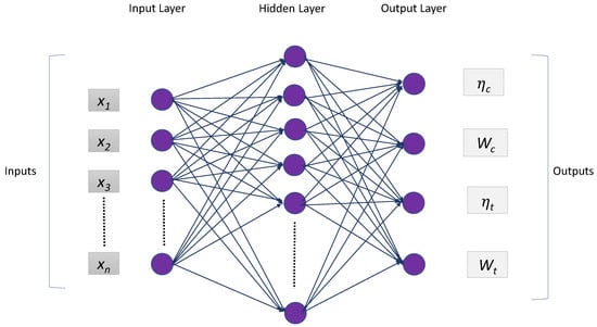 ANNs are machine learning-based tools that implement a virtual version of the human nervous system and its capacity to learn from experience. A typical ANN is formed by neurons, arranged in layers. Information fed in an ANN passes through the input layer, one or more hidden layers, to the output layer. Each neuron in a layer has its weight and is linked with the neurons of the adjacent layers. Input, hidden and output layers are formed by the input, hidden and output neurons, respectively. The number of input and output nodes is equal to the number of features given in input and to the number of variables to be predicted, respectively. The number of hidden layers and neurons is chosen arbitrarily, and it directly affects the ANN performance. Figure 3 reports a typical architecture of an ANN type used in this work.