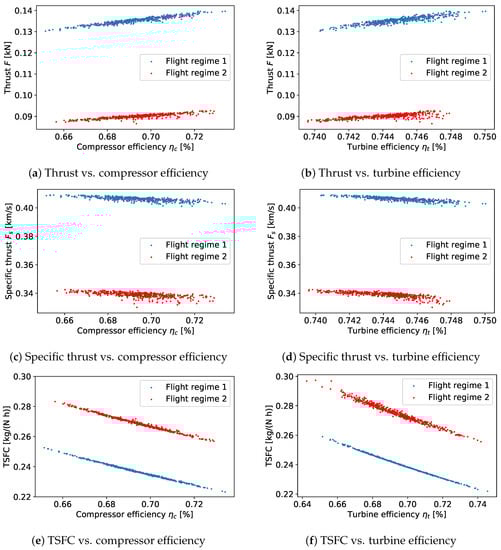 The engine performance under different degradation conditions was simulated in GSP. Figure 5 shows the impact of compressor or turbine efficiency on the thrust (F) and the thrust specific fuel consumption (TSFC) both at sea level (flight regime 1) and cruise (flight regime 2) for different degradation levels. For only this figure, separate datasets for each component with the same distribution were generated to analyze the impact of single-component efficiency. In Figure 5a,c,e, compressor is degraded while the turbine is clean and vice versa in Figure 5b,d,e. The performance trend is the same for both components. An increase in efficiency leads to a rise in F and a decrease in TSFC. The variation of the microturbine performance due to the degradation of the components is similar at and sea level. The turbine efficiency has a slightly higher impact on TSFC than compressor efficiency.
