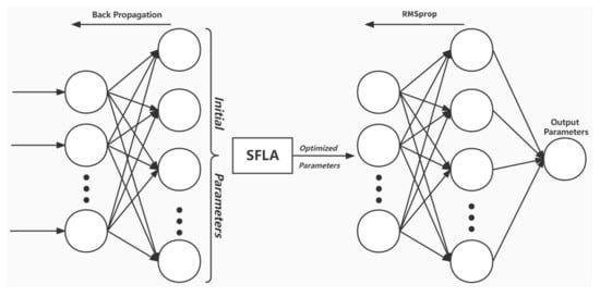 The logic of the hybrid prediction model proposed in this paper adopts meta-heuristic algorithm (SFLA) to adjust the parameters of typical feedforward ANN. While using the SFLA, we do not give up using the classical BP algorithm. This algorithm first provides high-quality initial parameters for the SFLA and prevents the meta-heuristic algorithm from starting the search process from too random areas (that is, the advantages of this algorithm compared with the model proposed in []), and in [], the parameters optimized by SFLA are directly input into ANN to start predicting. However, this model (i.e., BP-SFLA-ANN) ignores the drawback of the “randomness” strategy in SFLA. When the number of SFLA’s iterations reaches a certain number, subsequent iterations will be hard to effectively optimize the parameters. As shown in Figure 2, the number of iterations of SFLA reaches more than 50, its training error will not decrease. So in the last step, the parameters obtained from SFLA should be optimized by RMSprop algorithm again (RMSprop is more purposeful than SFLA and faster than classic BP), Figure 3 well demonstrates that using RMSprop for parameter optimization in the second half can make the training error show a fluctuating downward trend. The minimum value in this trend is the parameter we need. Figure 4 shows a structure diagram of the model. Firstly, the weights and biases in BPNN are used to form the initial frog population. The number of frogs, memeplexes, iterations, epochs (local search iterations), and the maximum jumping distance of frog individuals are set; Secondly optimization is carried out until the defined convergence conditions are met. Finally, the parameters obtained by SFLA are optimized by RMSprop. The new algorithm is verified by combined with training and test samples. The specific steps are as follows: