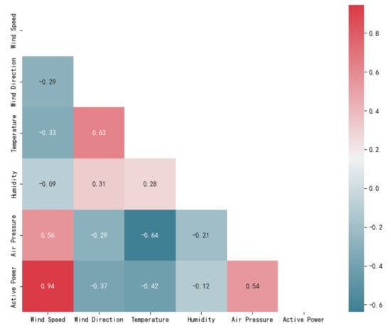 The wind power data sets are provided by China Southern Power Grid. The data sets record wind speed (m/s), wind direction (°), temperature (°C), humidity (RH), air pressure (HPA) and active power (MW) of the wind turbine in the past year. Each measurement interval is 15 min, and there are 52,429 sets of valid data in these wind farms. The data of the first five groups are shown in Table 1, and Figure 5 shows the correlation between the individual data features, we should ensure that the absolute value of the correlation of the data features for model training must be higher than the threshold (i.e., it is set 0.1 in this paper).