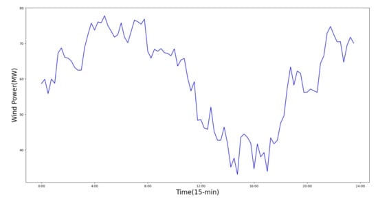 Although the presented model is forecasting the short-term wind power data (i.e., 5-min, 10-min, 15-min, …, 25-min, and 30-min), the optimization-prediction process will be repeated dozens of times to cover various types of changes in wind power output in a day or a week. The daily data must be sufficiently detailed to ensure model training, testing, and validation, Figure 6 depicts the someday wind power trend.