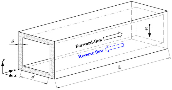 A single honeycomb ceramic conduit model is shown in Figure 1. The cross section of the conduit was square, the inner side length was d, the half thickness of the conduit wall was δ, and the conduit length was L. For simplification, it was assumed that (1) radiation heat transfer was ignored; (2) the gas was an incompressible ideal gas; and (3) the outside walls of the conduit were adiabatic.