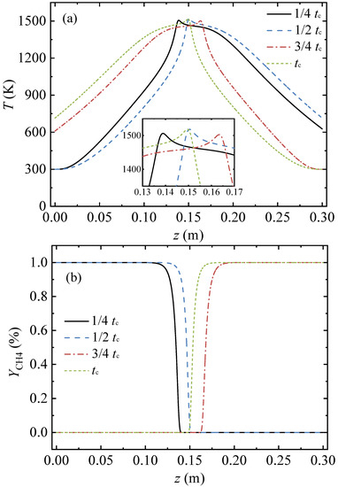 At the moment of the 1/4 cycle, the gas entered from the left of the conduit, the gas was heated by the hot conduit, and then the oxidation reaction of methane occurred. The methane volume fraction dropped from 1 vol% (at z = 0.118 m) to 0 (at z = 0.141 m), as shown in Figure 2b. The gas temperature rose sharply and reached a peak of 1506 K at z = 0.139 m. The high temperature gas then transferred heat to the conduit, while its own temperature gradually decreased. The cooled gas was discharged from the right side of the conduit. At the moment of 1/2 cycle, the point with the peak temperature of 1519 K moved to the point of z = 0.1505 m, the methane volume fraction dropped to 0 at z = 0.1525 m, and the gas temperature at z = 0.3 m increased as time passed.