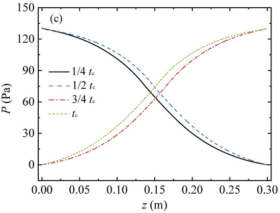 As the boundary condition of the pressure outlet was applied for the conduit outlet, the pressures of the conduit outlet for the four moments were constant at 0 Pa. The pressure profiles in the conduit exhibited an S-shape, as shown in Figure 2c. The pressure in the middle region of the conduit changed more sharply than those in the inlet and outlet regions. The pressure profiles of the first and the second half cycles were symmetrical along the center point of the conduit.
