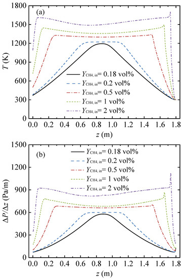 When the inlet methane volume fraction changes, the temperature distribution in the ceramic conduit changes, thereby affecting the pressure loss in the conduit. Figure 3 presents the gas temperature and pressure gradient profiles in the honeycomb ceramic conduit under various inlet methane volume fractions. In this series of cases, the conduit length L = 1.8 m, the inlet velocity uin = 1 m/s, and the cycle time tc = 120 s.