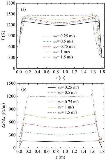 Gas temperature and pressure gradient profiles along the arial direction in the conduit, with various inlet velocities: (a) gas temperature profiles and (b) pressure gradient profiles.