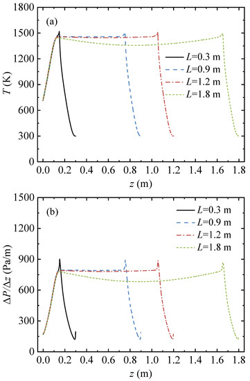 Gas temperature and pressure gradient profiles along the arial direction in the conduit, with various conduit lengths: (a) gas temperature profiles and (b) pressure gradient profiles.