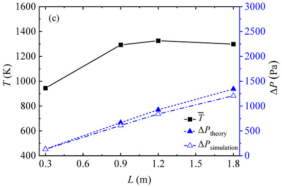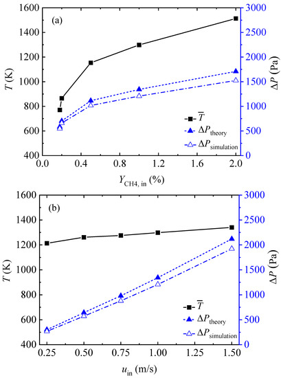 As shown in Figure 7d, the main reason for the deviations between the theoretical and the simulation results may have been the high mean gas temperature. The red trend line in Figure 7d shows that the deviations generally increased with the increase in the mean temperature. The deviations with a mean temperature of less than 1000 K were much lower than those with a mean temperature of higher than 1000 K. Another reason for the deviations was that the mixture of methane and air was simplified to air. This simplification brought about the differences in the physical parameters between the mixture and the air, which, in turn, affected the calculation of the pressure loss.
