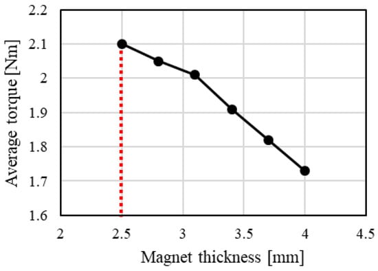 In the examination of this section, in order not to complicate factors of torque fluctuation, the effect of each dimensional parameter represented by the electric and magnetic loading on the torque was verified by the FEM under the condition that some dimensional parameters interfered with by the electric and magnetic loading are fixed. Figure 2 shows the torque with respect to the magnet thickness, where the slot width is fixed at 9.8 mm. It is found that the maximum torque is obtained at around 2.5 mm, which is a manufacturing limit. It is considered that this is due to the fact that the thinner the magnet is, the larger the slot volume is because the motor size is kept constant.