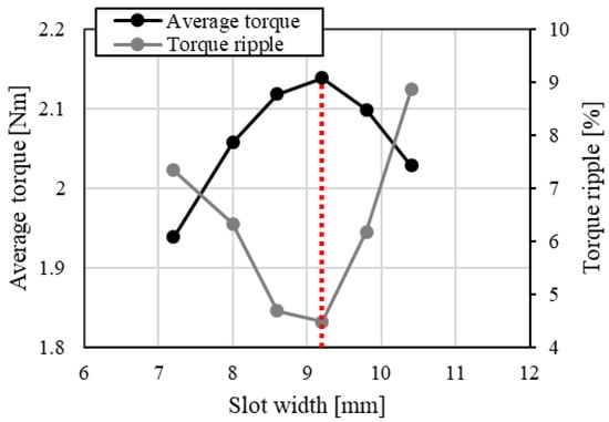 Figure 3 shows an average torque and a torque ripple with respect to the slot width. The magnet thickness is fixed at 2.5 mm. It can be seen that the torque is the highest when the slot width is 9.2 mm, and the torque ripple is the lowest. From Figure 3, it can be seen that the slot width in which the product of the electric loading and the magnetic loading becomes the largest is 9.2 mm. Furthermore, the torque ripple tends to have a low value because of a structure peculiar to the axial-gap motor in which the end surfaces extend in the radial direction of the magnet, and the stator teeth are relatively skewed. In particular, the slot width of 9.2 mm is considered to be caused by the fact that the instantaneous torque generated by each tooth has a countervailing relation.