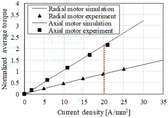 Figure 4 shows the average torque with respect to the current density obtained in the analysis and the measurement. The analysis value is the electromagnetic field analysis simulation result based on the FEM. It shows that the torque density of the axial-gap motor is twice that of the radial-gap motor. It can also be seen that the analytical value and the measured value are almost the same. As described above, it has been found that the axial-gap motor can have a higher torque density than the radial-gap motor at a flatness ratio of 0.3.