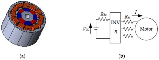 Figure 5 shows a benchmark motor and its motor drive circuit for small in-vehicle motor applications [], and Figure 6 shows the operating characteristics of the benchmark model. In Figure 5b, Rdc is a DC bus resistance, Rac is a wire harness resistance, η is an inverter efficiency, Vdc is a DC power supply voltage, and I is a line current. The motor diameter is 80 mm, and the motor stack length is 62.5 mm. The benchmark motor has a typical radial-gap configuration: an SPM-type rotor with 8 poles and a 12 slot stator with three-phase concentrated windings. The magnet volume of the benchmark motor is 22,688 mm3. Under these conditions, we studied increasing the torque density of an axial-gap motor. The study’s goal was to reduce the volume of the motor by half while maintaining the same output as the benchmark motor. Table 3 shows the prerequisites for the designed axial-gap motor.