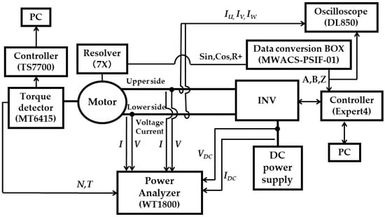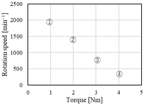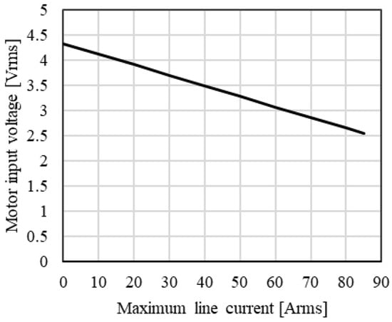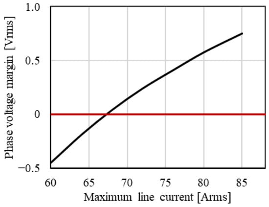 Figure 8 shows the result calculated from the above equation. The minimum Vmgn is obtained at the operating point ①, where the influence of E is great among the target speed–torque characteristics, and the effective voltage can be obtained at 68 Arms or more for Imax.