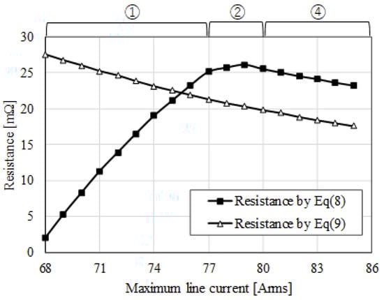Figure 9 shows the designable r with respect to the maximum line current. Numbers indicate the operating points used in the calculation in Equation (8) in Figure 9. It is considered that Vmgn can be ensured with a margin by designing Imax in the range of 80 to 84 Arms because the impact of voltage drop due to the iron loss, which is not considered in this calculation, is small at the operating point ④, where the rotational speed is low.
