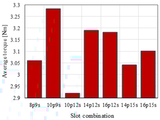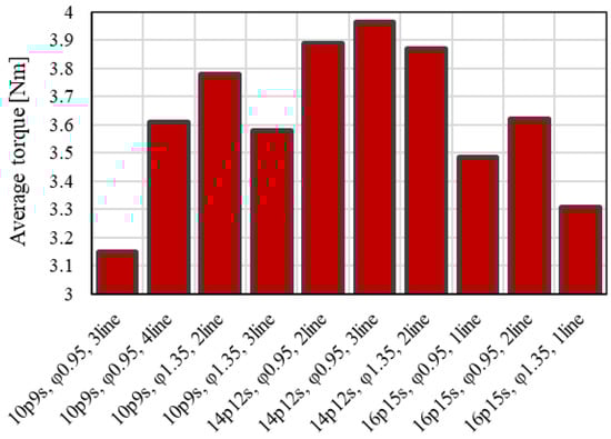 Figure 10 shows the torque with respect to the pole–slot combination. Since it is not possible to compare models with different numbers of slots, an appropriate number of poles in each number of slots is chosen. Table 4 shows the winding factor for each number of poles and slots in a concentrated winding and the basic order of torque ripple at each number of poles. The smaller the number of slots is, the less difficult it is to make the stator, and the smaller the insulator volume of the entire stator. Therefore, a smaller number of slots increases the ratio of windings to slot area, leading to an increase in the number of coil turns. The larger the number of poles is, the higher the torque is, but at the same time, the amount of flux leakage between the poles increases, which also results in lower torque. In addition, the larger the number of poles is, the larger the order of torque ripple is, the smaller the torque ripple rate is, and the lower the motor’s vibration. Slot specifications of 6 slot or less are unbalanced considering the motor outer diameter dimensions, and 18 slot or more are out of consideration due to high manufacturing difficulty. The number of poles is chosen in the range of 8 pole to 16 pole with the same idea. For each number of slots, the number of poles with a large winding factor was selected to be compared for torque characteristics. The 9 slot structure was analyzed for 8 pole and 10 pole; the 12 slot structure for 10 pole, 14 pole, and 16 pole; and the 15 slot structure for 14 pole and 16 pole. Since the stator teeth shape is an open slot shape in the axial-gap motors, it is considered that the winding factor is slightly different from the general winding factor shown in Table 4, and this effect is believed to be reflected as torque. As a result, 10p9s (10 poles, 9 slots), 14p12s, and 16p15s, were selected for the pole–slot combination.