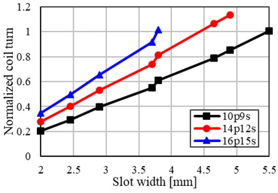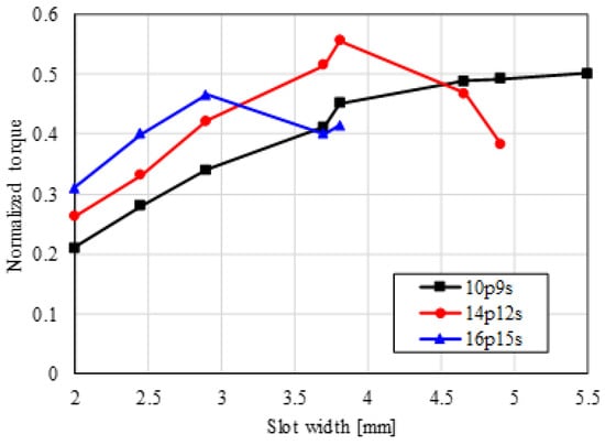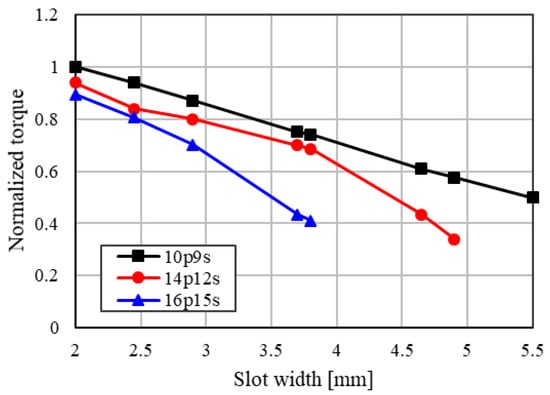 Next, the tooth cross-section is examined. As mentioned in Section 2, the magnetic loading also changes with the change of the tooth cross-section area, so the tooth cross-section is not an independent parameter. Therefore, the relationship between the tooth cross-sectional area and the shape of the magnet is freely determined in each model. However, the overhang of the magnet shall be 0 mm. Additionally, to be independent of the number of coil turns, the ampere turn is constant, and the torque characteristics with respect to tooth cross-sectional area are calculated. Figure 13 shows the change in torque due to the effect of the tooth cross-sectional area, with the horizontal axis being the slot width. It is normalized based on the torque when the slot width is 2.0 mm in 10p9s, which has the largest tooth cross-section. The torque increases as the slot width are narrower because the magnet shape is changed by the stator shape, which increases the amount of magnet used. Thus far, the number of coil turns and the tooth cross-section, which varies with the slot width, have been examined. Finally, torque with respect to slot width is shown in Figure 14. It is calculated by the product of the number of coil turns and torque with respect to the tooth cross-sectional area. It is considered that the number of coil turns (N) affects the torque in the first study in Figure 11. In the next study of the tooth cross-sectional area, the magnet flux due to the change in magnet shape accompanying the change in stator shape affects the torque, and the difference in the number of pole pairs (Pn) at each number of slots affects the torque. Thus, it can be seen from the torque equation in Equation (2) that each study can make an independent study. In the study of the number of coil turns in Figure 11, the number of coil turns increases (torque increases) in proportion to the slot width. In contrast, in the study of the tooth cross-sectional area in Figure 13, the torque decreases with the slot width. This trade-off relationship results in a change in torque characteristics that peaks for a change in the slot width in each model, as shown in Figure 14. Therefore, the slot width where the torque peaks are considered the maximum torque in each model. As a result, it was found that the slot width of 3.8 mm with 14p12s was the largest torque.