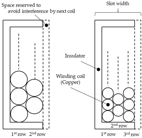 where Sn is the number of slots, and N0 is the number of coil turns per unit slot stack length. Figure 11 shows the normalized number of coil turns with respect to the slot width. This standardization is based on the number of turns in 5.5 mm for a slot width of 10p9s. It is found that the number of coil turns increases in proportion to the slot width in any pole–slot combination. When the slot width increases from 3.7 mm to 3.8 mm, the number of coil turns increases rapidly, this is thought to be due to the space factor. As shown in Figure 12, when the slot width is 3.7 mm, two rows of coils of 1.35 mm for winding diameter are wound, and when the slot width is 3.8 mm, three rows of coils of 0.95 mm for winding diameter are wound. Therefore, it is found that the space factor increases when the number of columns is odd, such as the slot width of 3.8 mm.