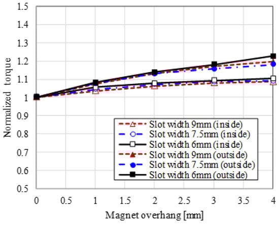 Since the magnet overhang has been kept constant in the previous study, there is a margin in the magnet quantity. Therefore, the characteristics of torque with respect to magnet overhang are examined. Considering that the position of the tooth outer diameter and the slot cross-sectional area may have an effect, the slot width was set to 3 points of 6 mm, 7.5 mm, and 9 mm. Figure 15 shows the result of examining the torque with respect to magnet overhang. The torque for the overhang quantity is expected to increase about 1.2 times on the outside and about 1.1 times on the inside. It is also found that the relationship between the overhang amount and the torque tends to be the same for all the slot widths. In the final stage of determining the motor parameter, it is designed to allocate the usable magnet quantity to the inner and outer diameters’ overhang to maximize the torque. Increasing torque is greater in the overhang on the outer diameter side than on the inner diameter side because more magnet volume is used when magnets are placed on the outer diameter side. In addition, in the case of an axial-gap motor, the distance between the point at which the force and the point on the axis of rotation are longer in the outer diameter section than in the inner diameter section, so that overhang on the outer diameter side results in greater rotational force. Therefore, if there is a limit to the volume of magnets, it is considered that increasing the overhang amount on the outer diameter side is more effective in increasing torque.