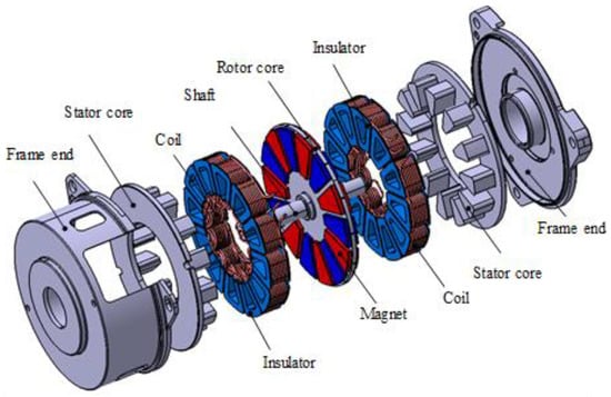 Figure 1 shows a typical radial-gap type benchmark motor and an illustration of an axial-gap motor. The radial-gap motor’s number of poles and slots is 8 poles and 12 slots (8p12s). The axial-gap motor structure was designed using electromagnetic field analysis simulation based on the finite element method (FEM). The axial-gap motor’s number of poles and slots was 16p12s because the winding factor is the same as the radial-gap motor, and the torque can be increased by increasing the number of poles. The axial-gap motor has dual open-slot stators with concentrated windings.