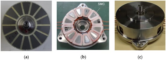 - Tsunata, R.; Takemoto, M.; Ogasawara, S.; Saito, T.; Ueno, T. SMC Development Guidelines for Axial Flux PM Machines Employing Coreless Rotor Structure for Enhancing Efficiency Based on Experimental Results. IEEE Trans. Ind. Appl. Appl. 2022, 58, 3470–3485. [Google Scholar] [CrossRef]