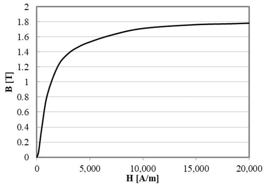 Figure 17 shows the structure of a prototype axial-gap motor, and Figure 18 shows a prototype axial-gap motor. Table 5 shows the specifications of the axial-gap motor. The motor diameter is 80 mm, stack length is 34.8 mm, and the prototype motor has an SPM type rotor with 14 poles, and a 12 slot stator with a three-phase concentrated winding. Since the magnetic circuit in the stator core is three-dimensional, Soft Magnetic Composite (SMC) is used for the stator core, and an insulator for insulation is used. The B–H characteristics of SMC are shown in Figure 19. It can be seen that the maximum saturation magnetic flux density of the SMC used in the axial-gap motor is about 1.8 T, while the maximum saturation magnetic flux density of the magnetic steel sheet used as the stator core in the radial-gap motor is about 2.0 T. The magnet material is SmFeN magnet, and the magnets are adhered to and held to a rotor core having a circular lattice shape. The windings are connected in two parallel and four lines with a star configuration. A resolver is used to sense the rotor position.