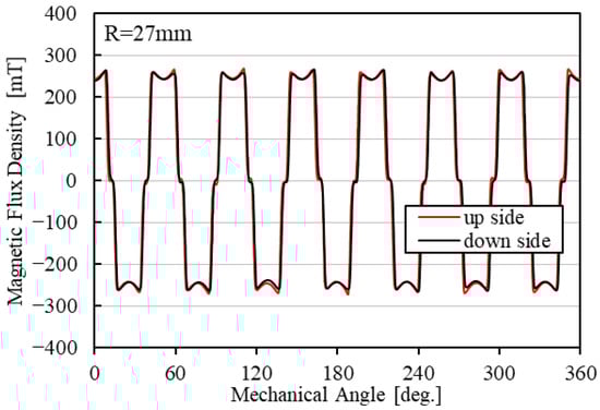 After the unmagnetized magnet of the prototype axial-gap motor was bonded to the rotor core, the magnet was magnetized by the magnetizing system. Figure 20 shows the rotor’s surface magnetic flux density waveform on the up and downside when the measured radial center radius r is 27 mm. It can be seen that there is little variation in each pole and the ups and downsides. Figure 21 shows the back e.m.f. waveform at a rotating speed of 1000 r/min. Total harmonic distribution (THD) of the back e.m.f. was calculated by: