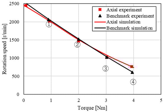 Figure 23 shows the target operation characteristics and the speed–torque characteristics of the simulation value and the experiment value of the axial-gap motor and the radial benchmark motor. Figure 24 shows the measurement system configuration. The prototype of the axial-gap motor was found to have the same maximum torque as the benchmark motor. The torque per magnet volume improved by 47%. It is confirmed that the axial-gap motor has a motor structure that can effectively use magnets than the benchmark motor. Figure 22 shows that the characteristics of the designed axial-gap motor exceed the target. Additionally, it can be seen that the analytical values and the experimental value are almost the same.