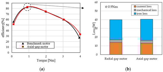 Efficiency with respect to torque of benchmark motor and axial-gap motor: (a) efficiency with respect to torque; (b) loss analysis at 0.9 Nm.