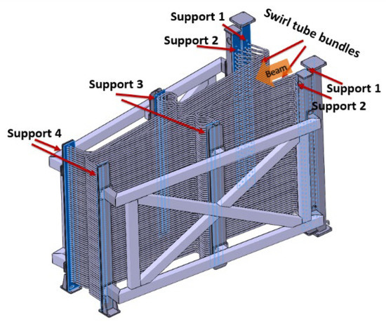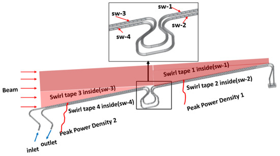 The detailed structural design of the CFETR NNBI calorimeter [13] is shown in Figure 1. The swirl tube bundles with a large length-diameter ratio are arranged in parallel. The swirl tube bundle is arranged in the front and back, and the front and back are staggered up and down. The staggered detailed size: 16.5 mm in front and back, 32 mm up and down, and the coincidence rate was 40%, each swirl tube was more than 3 m, the length-diameter ratio was 187.5, and the middle section design of every single tube was a U-shaped transition, which could effectively alleviate the thermal expansion and cold contraction. There are four different supports for the swirl tube model fixed on the support frame, the two ends of the single tube are fixed onto the support of the main pipeline shown as support 1 and support 2, and support 4 links the front and back swirl tubes, the middle section of the U-shaped tube is supported and defined as support 3. The material of the tube was CuCrZr, and the inner diameter of the cooling tubes was 16 mm, with a 2 mm thickness of the inserted stainless steel swirl tape. The high heat fluxes imposed on the inside part of the calorimeter are shown in Figure 2. Deionized water was chosen as the working coolant. The detailed physical parameters are shown in Table 1. The materials of the tube and swirl tape are considered homogeneous, uniform, and isotropic. Due to the complexity of the calorimeter, a basic large length-diameter ratio swirl tube modular in this HHF calorimeter component will be taken as a study object in the following sections, shown in Figure 2. Figure 2 shows a basic circuit formed by the front and back swirl pipes. The swirl structure is fixed inside the pipe, and the beam bombardment is on the pipe’s outer surface. The deposition power density on the front and back pipe surfaces is the same, and the heat-loaded area was calculated according to the actual beam deposition surface. According to the beam distribution, the whole tube bundle was roughly divided into two parts according to the beam distribution, and the middle part was connected and fixed with a U-shaped structure, which can alleviate the problem of deformation and reduce the temperature rise. Therefore, the heat density on the heat-loaded surface was also divided into two parts, the part near the beam inlet is defined as peak power density 2, which is slightly smaller than the part at the beam outlet (defined as peak power density 1), as shown in Figure 2. Correspondingly, the tape inserted inside was divided into four parts: swirl tape 1 inside (sw-1), swirl tape 2 inside (sw-2), swirl tape 3 inside (sw-3), and swirl tape 4 inside (sw-4).