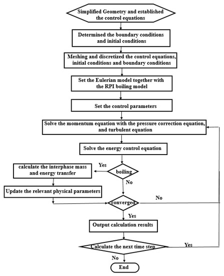 The whole calculation process is shown in Figure 3. (1) Firstly, the control equations are established, and the boundary conditions and initial conditions are determined according to the actual operation condition. (2) The model is meshed, and then the control equations, initial conditions, and boundary conditions are discretized. The control parameters in the solution process are set to detect the convergence of the results. (3) Using the Eulerian model of heterogeneous flow, taking the fluid as the continuous phase and the gas as the dispersed phase, the momentum and energy control equations are solved, and the relevant empirical formulas of the RPI-related boiling model are coupled to calculate the interphase mass and energy transfer. According to the empirical formula, it is judged whether the fluid temperature near the wall is boiling or not. If yes, the gas phase fraction generated by boiling should be calculated, and the relevant physical parameters need to be updated accordingly. Next, it is judged whether the calculation process has converged and, if yes, the calculation is completed, and the calculation result is output. If it does not converge, one should return to solve the governing equation again, and the solution iterates until the calculation parameters meet the convergence definition, and then the calculation of the current time step is completed, and the simulation of the next time step can be performed until the end of the simulation time.