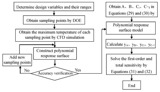 Setting the parameters shown in Table 3 as the design variables and the maximum temperature of the structure as the objective function, 60 groups of design sample points were selected in the given design space, and the corresponding maximum temperatures were obtained by the CFD simulation proposed in Section 3. Then the polynomial response surface model between the design variables and the maximum temperature was established, and its accuracy was tested according to Equation (20). Based on the polynomial response surface model, the proposed Sobol method was used to solve the first-order sensitivity coefficient and the total sensitivity coefficient of each design variable.