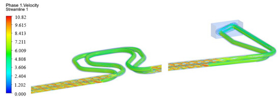 The velocity profile of the front swirl tube is shown in Figure 6, the temperature profiles of the front and back swirl tubes are shown in Figure 7, and the distribution of the void fraction inside the swirl tube under one-side heating is shown in Figure 8. From Figure 6, Figure 7 and Figure 8, one can find that the boundary layer was greatly disturbed by the addition of swirl tapes, the fluid velocity in the pipe where the swirl tape structure was arranged was effectively increased, and the maximum velocity of the fluid was up to 10.8 m/s. For the one-side heating tube, the maximum temperature appeared in the heat-loaded surface, responding to the peak power density 2 area in Figure 2, and the value was 606.7 K, which is far lower than the softening temperature of CuCrZr (823 K). The maximum temperature of the back swirl tube was 578.3 K, much lower than that of the front one, and the difference value was about 28.4 K. The total temperature rising of the cooling water was about 18.1 K. Along the direction of water flow, the water temperature rose gradually, and in the four straight pipe sections, the wall temperature of the heat-loaded surface was usually higher at the end of the swirl tape. Among them, the wall temperature at the inner side near the beam changed greatly, and the corresponding water temperature near the heat-loaded surface reached 578.3 K, far exceeding 485.55 K at the working pressure of 2 MPa. In addition, the maximum value of the corresponding heat transfer coefficient was about 41,100 W/(m2·K), and a large number of bubbles appeared in the front rows, while the maximum section void fraction was 0.039% and appeared at a distance of about 0.1 m from the entrance of the calorimeter structure. When the length of the swirl tape was shorter than the heat-loaded surface, bubbles appeared on the heat-loaded surface without the swirl tape structure, and the corresponding pressure drop of the whole circle was about 1.38 MPa.