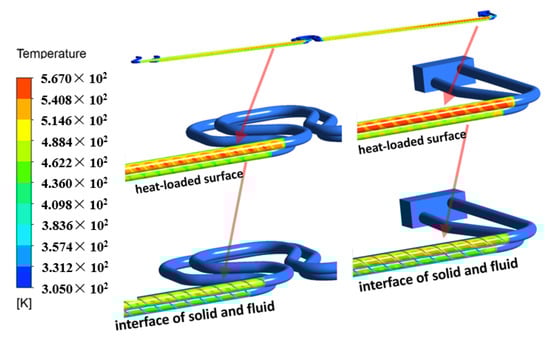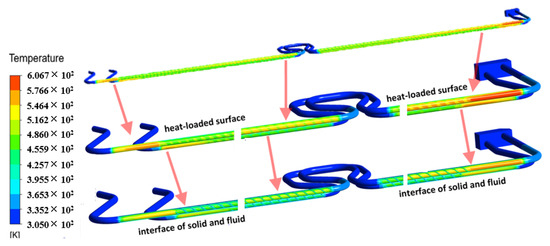 According to the actual processing technology, the maximum length of the swirl tape inside the tubes is the length of the heat-loaded surface. If the length of the tape is too long and exceeds the length of the heat-loaded surface, the tape will deviate from the axis and bend, resulting in an uneven local flow. According to the change of heat-loaded surface, the length of the front and back and inner and outer four zones were slightly different. The maximum length of the tape length corresponds to the length of the heat-loaded surface: 1.6 m/1.56 m/1.56 m/1.36 m. In order to analyze the influence of different tape lengths on the heat transfer performance, three values of 1.44 m, 1.5 m, and 1.6 m for sw-1 were selected, and the other three tape lengths remained unchanged. The heat transfer performance of the swirl tube was more obvious than the smooth tube, as shown in Figure 11 and Figure 12. When the tape length of the sw-1 became larger and approached the length of the heat-loaded surface, the heat transfer performance became better at the position where the tape was added, and the overall surface temperature decreased (From 606.7 K to 567 K). Compared with the temperature field in Figure 7, the overheating and localized bubbles no longer occurred at the entrance of the structure, and the corresponding maximum bubble volume fraction decreased significantly (3.96 × 10−4, 2.8 × 10−4, 1.92 × 10−4). In addition, since only the length of the swirl tape in the tube was changed, the flow velocity in the tube was unchanged (still around 10.8 m/s).