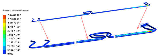 Based on the above liquid-vapor two-phase flow model and numerical solution method, the enhanced heat transfer performance of the swirl tube structure with a large length diameter ratio is presented in this section. As described in Section 2, the basic structural parameters for simulation analysis are shown in Table 2, including tape width, twist length (twist ratio), and tape length inserted in four different areas.