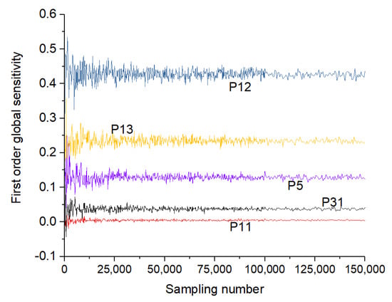 The calculation results of the Sobol global sensitivity analysis have a great relationship with the sampling size in Equation (29). When the sampling size is small, it is difficult to reflect the real effect of parameter changes on the model output. Here the Latin hypercube sampling method was used to obtain the parameter samples. The first-order sensitivity of some design parameters to the maximum temperature under different sampling sizes is shown in Figure 9. The first-order sensitivity data tends to be stable with the increase in sampling size. The sensitivity analysis of the design parameters to the enhanced heat transfer performance was carried out based on the calculation results with a sampling number of 200,000. The calculation results are shown in Table 4 and Figure 10, respectively.