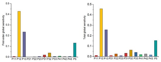where is the “main effect” index or first-order sensitivity of the parameter , which describes the contribution of random factors on the total variance of the output by oneself; is the order sensitivity, which describes the contribution of the interaction of random factors to the total variance of the output.