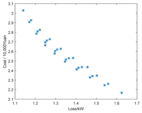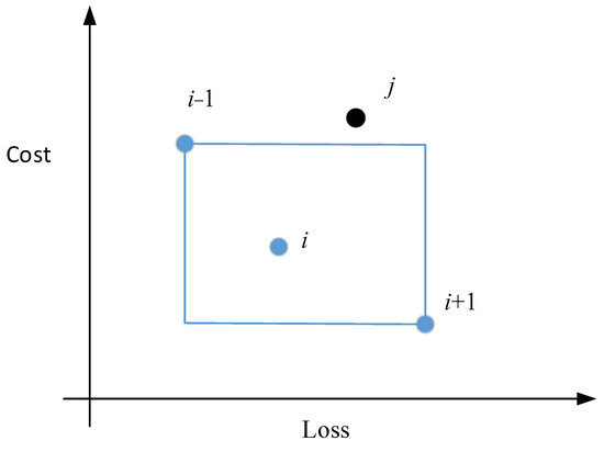 - Fast non-domination sorting and crowding distance calculation of the initial population. Dominance and non-dominance are the focus of the process, as shown in Figure 5. If both the cost and loss for individual i are smaller than individual j, then i dominates j. Otherwise it is a non-dominated relationship. As shown in Figure 5, the cost and loss of individual i are less than individual j, indicating that i dominates j. However, though the loss of individual i is smaller than that of i + 1, the cost of individual i is higher than that of i + 1. Thus, i and i + 1 does not constitute a dominant relationship. This is the same for individuals i and i − 1. All the solutions in the population that are not dominated by other solutions constitute the non-dominated frontier, i.e., the Pareto optimal solution set. The rank of all the individuals in the non-dominated frontier was set to 1. After that, all the individuals with rank 1 were removed and the above operation was repeated for the rest of the population until the non-dominated sorting of all the individuals was completed. The crowding distance of individuals under the same dominance rank was sorted and calculated according to the magnitude of the optimized indexes, where the crowding distance of two boundary solutions is infinity and the crowding distance of the ith individual can be defined as the sum of its distances to individual i − 1 and individual i + 1 on each axis component, which is half of the perimeter of the rectangle in Figure 5.