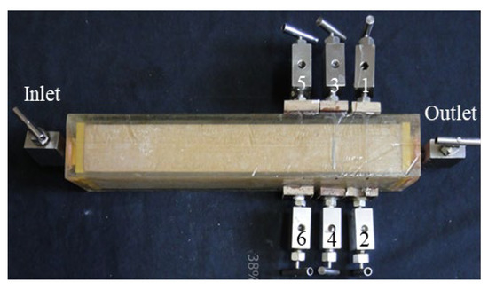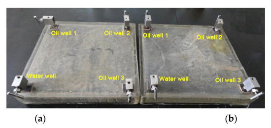 The main and auxiliary agents for profile control were sodium silicate and calcium chloride, respectively. The model oil used in the experiment was a mixture of kerosene and degassed crude oil from Oilfield N in Bohai, and different mixtures were prepared to simulate oil with different viscosities: 590, 175, 57.0, 36.8, 19.9, and 10.8 mPa·s at 55 °C. Water was prepared to simulate the injected water from Bohai Oilfield N, with a salinity of 2152 mg/L with the following composition: 656 mg/L K+ and Na+, 6 mg/L Mg2+, 35 mg/L Ca2+, 364 mg/L C1−, 13 mg/L SO42−, 1027 mg/L HCO3−, and 50 mg/L CO32−. An artificial core, cemented by quartz sand and epoxy resin was used [27,28]. Three types of cores were prepared: (1) Homogeneous rectangular core (sized 4.5 cm × 4.5 cm × 30 cm) to characterize the seepage with a gas permeability of 2000 × 10−3 μm2; (2) Multilayer heterogeneous cores (sized 4.5 cm × 4.5 cm × 30 cm) for oil displacement experiment; (3) Well pattern model sized 4.5 cm × 30 cm × 30 cm. The multilayer heterogeneous core and well pattern model contained three layers with high, medium and low permeability. Threshold pressure testing was performed using a sand-filled pipe with a radius of 3.8 cm and length of 30 cm, and the gas permeability was 2000 × 10−3 μm2.