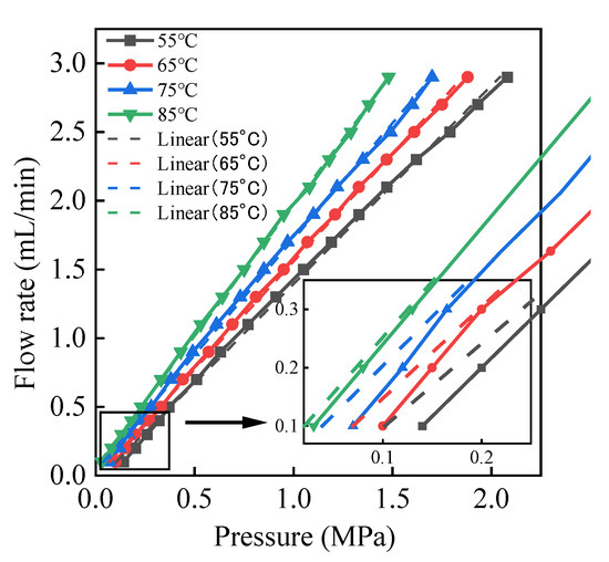 The relationship between the heavy oil flow rate and injection pressure was nonlinear at low injection pressure. The flow threshold pressure at 55 °C was 0.02 MPa/m and decreased as the temperature increased from 55 to 85 °C. In other words, the temperature considerably influenced the heavy oil seepage flow. At low-pressure gradients, heavy oil flowed at an extremely low velocity, and the flow velocity was nonlinearly related to the pressure gradient. Moreover, the heavy oil flow exhibited non-Darcy characteristics. Under high-pressure gradients, the network structure formed by the asphaltene association of heavy oil is disrupted and the flow takes on a Darcy character. When the temperature is high or the pressure gradient is high, the asphaltene association of heavy oil forms a network structure that is disrupted and exhibits the characteristics of a Newtonian fluid, satisfying the Darcy permeability characteristic, with a displacement proportional to the pressure. In general, heavy oil contains a large amount of resin, asphaltene, and wax, which can form a three-dimensional stable network structure with a high stiffness that protects it from damage at low temperature. These components typically exhibit high threshold pressures with strong interaction forces on the pore surface. As the temperature increases, the network structure of these components is gradually destroyed, and the stiffness and interaction force on the pore surface decrease, resulting in lower flow threshold pressure [31,32,33,34].