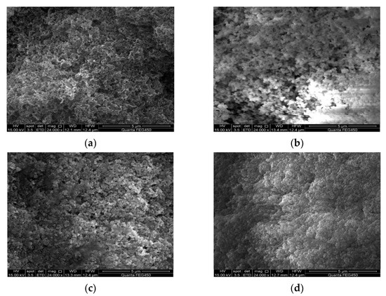 SEM images of inorganic gel. (a) T = 55 °C (0 d); (b) T = 140 °C (0 d); (c) T = 55 °C (5 d); (d) T = 140 °C (5 d).