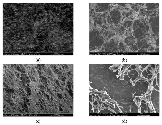 SEM images of polymer gel. (a) T = 55 °C (0 d); (b) T = 140 °C (0 d); (c) T = 55 °C (5 d); (d) T = 140 °C (5 d).