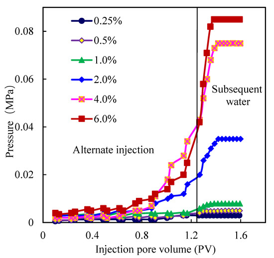 Inorganic gel plugging experiments were conducted using the homogeneous rectangular cores, with the following schemes: (1) The cores were evacuated and saturated by water. (2) The main agent solution, 0.1 pore volume (PV) gel, was injected with concentrations of 0.25%, 0.5%, 1%, 2%, 4%, and 6%. This injection was followed by the injection of water (0.02 PV) and auxiliary agent (0.1 PV) with the same concentration as that of the main agent, and water (0.02 PV). (3) Step (2) was repeated to perform five injection cycles. (4) After retaining this setup for 12 h, water was injected until the pressure became constant, the pressure at each measurement point was recorded, and the relationships between the pressure and injection PV at different time instants were obtained.
