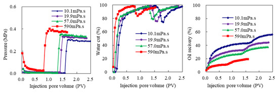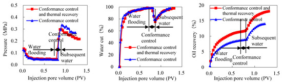 The relationships between the injection pressure, water cut, oil recovery, and injection PV are shown in Figure 6 and Figure 7.